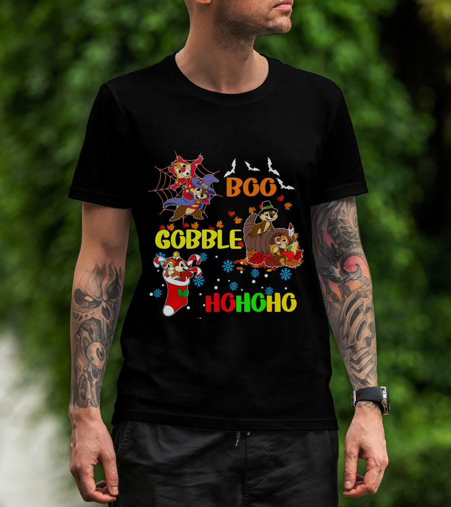 Chip And Dale Boo Gobble HoHoHo Halloween Thanksgiving Christmas T-Shirt