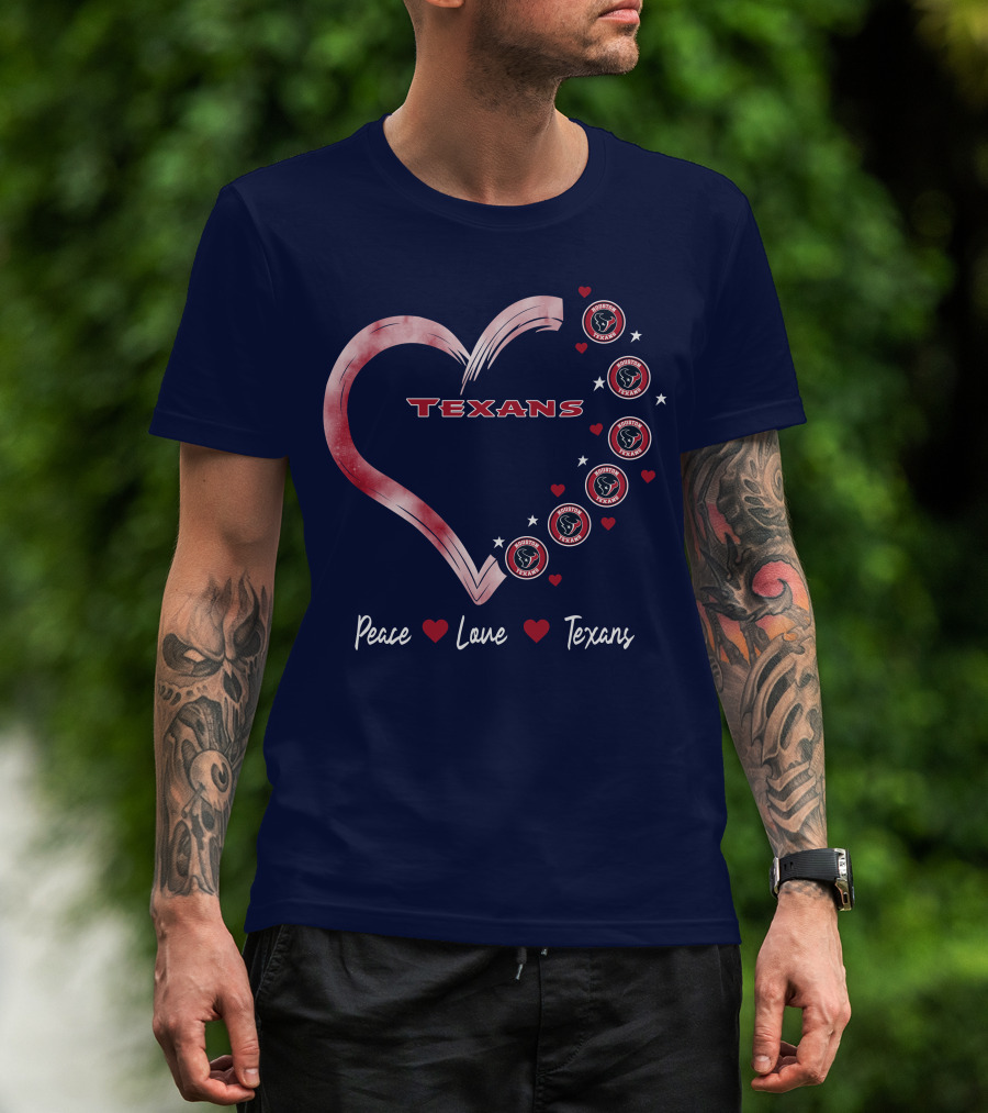 The Peace Love Heart Houston Texans T-shirt is designed for everyday wear and a consistent fit. Fabric is pre-shrunk ring-spun cotton with durable stitching. See the size chart below for exact measurements.