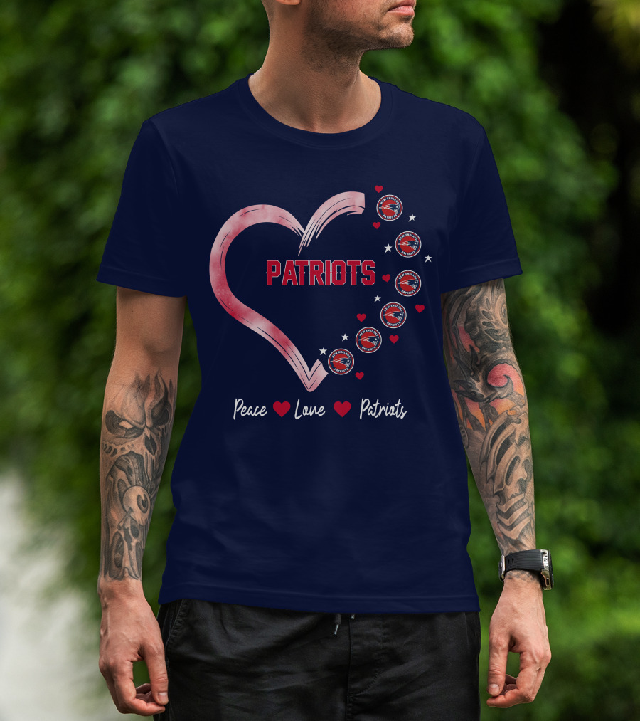 The Patriots Peace Love Heart T-shirt is designed for everyday wear and a consistent fit. Fabric is pre-shrunk ring-spun cotton with durable stitching. See the size chart below for exact measurements.