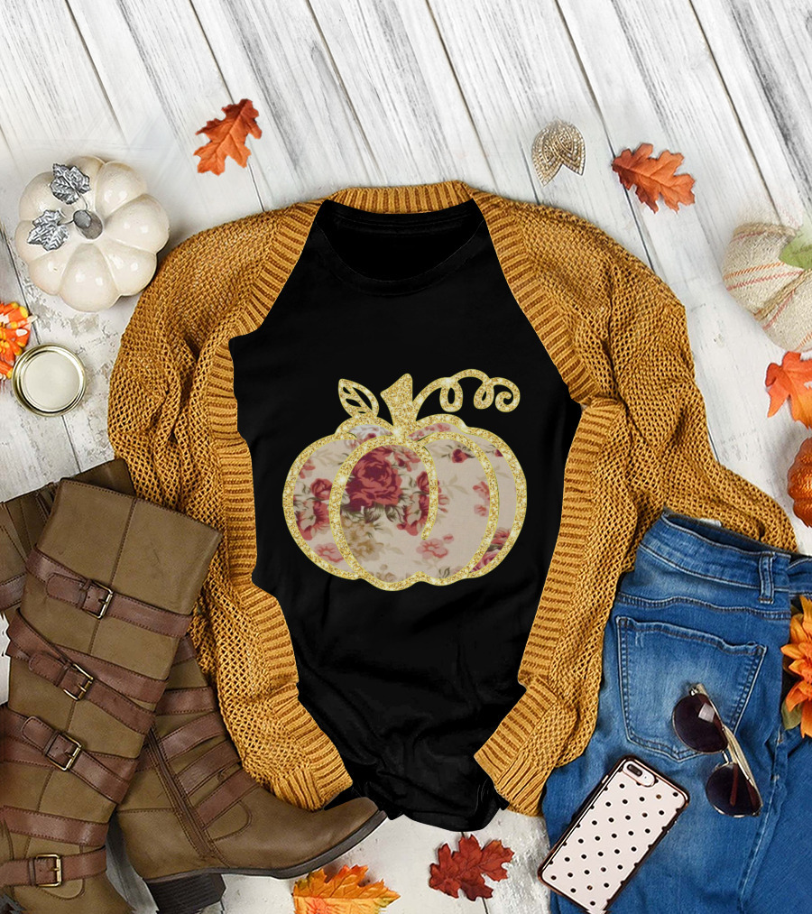 Glitter Floral Pumpkin Gold Trim T-Shirt