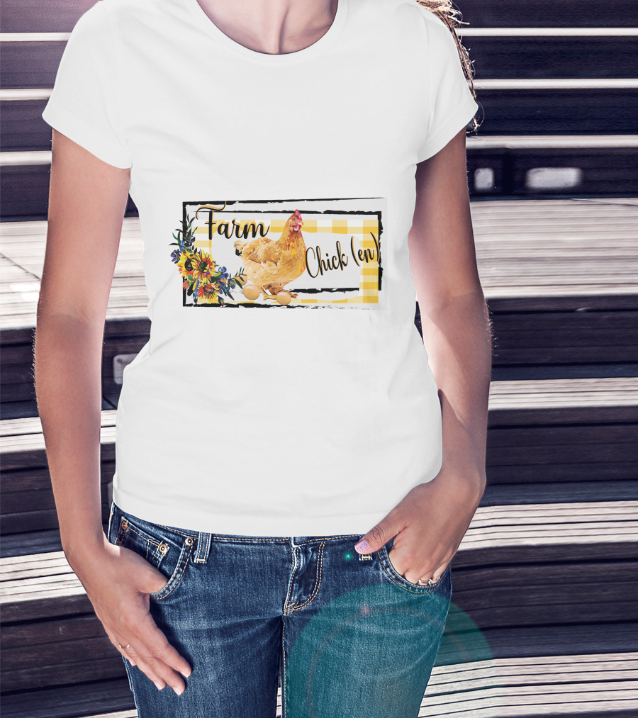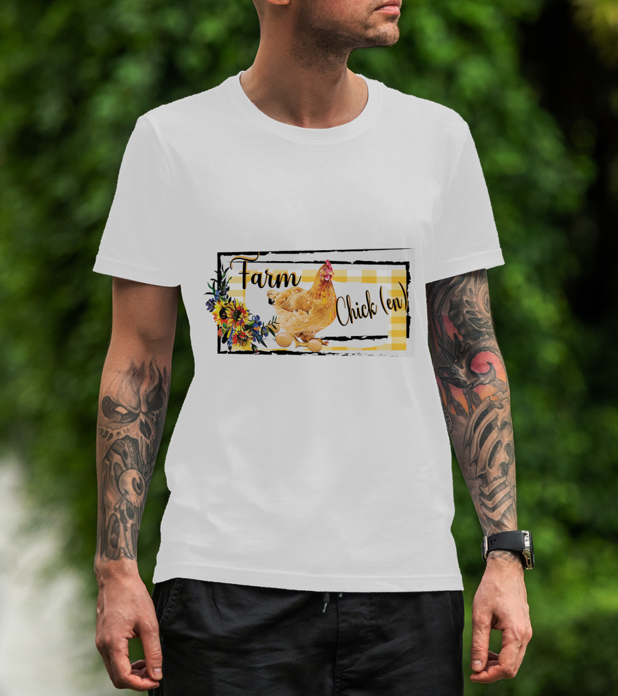 The Farm Chicken Sunflower Fall Thanksgiving T-shirt is designed for everyday wear and a consistent fit. Fabric is pre-shrunk ring-spun cotton with durable stitching. See the size chart below for exact measurements.