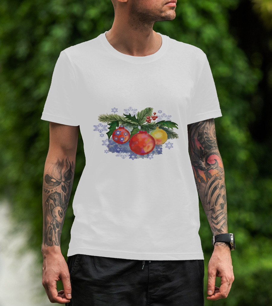 The Watercolor Christmas Balls Ornaments with Pine Leaves and Snowflakes T-shirt is designed for everyday wear and a consistent fit. Fabric is pre-shrunk ring-spun cotton with durable stitching. See the size chart below for exact measurements.