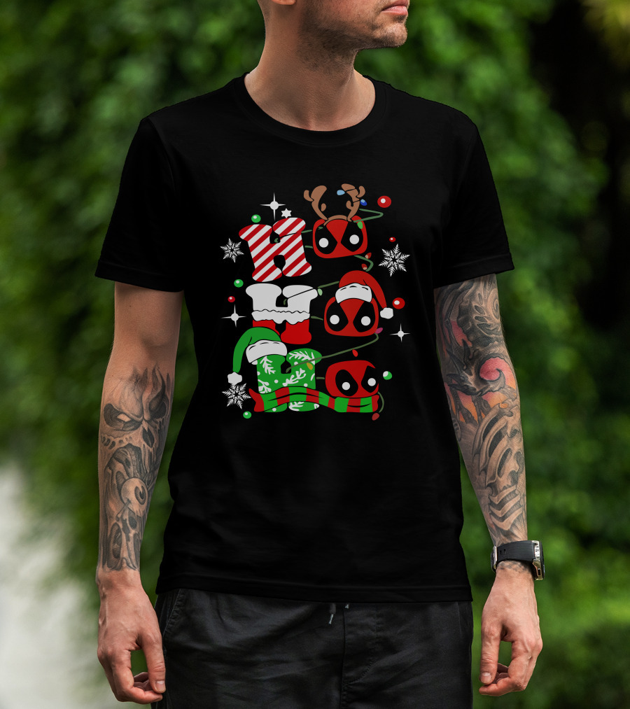 The Deadpool Ho Ho Ho Christmas Reindeer Antlers Santa Hat Snowflakes T-shirt is designed for everyday wear and a consistent fit. Fabric is pre-shrunk ring-spun cotton with durable stitching. See the size chart below for exact measurements.