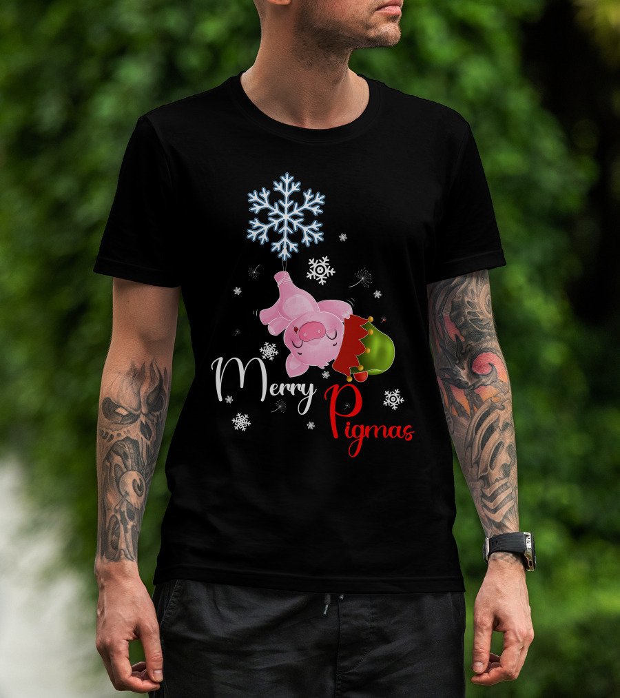 Merry Pigmas Pig Hanging From Snowflake With Santa Hat And Snowflakes T-Shirt