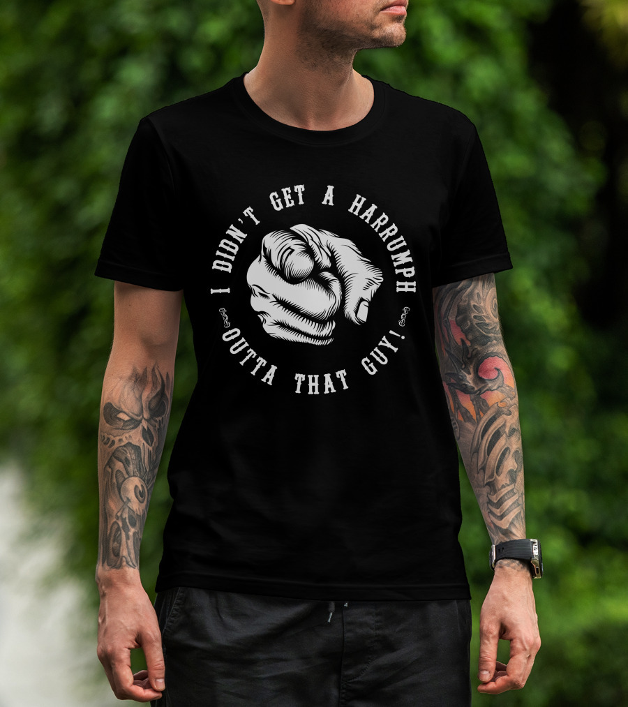 The I Didn't Get A Harrumph Outta That Guy Blazing Saddles Pointing Hand T-shirt is designed for everyday wear and a consistent fit. Fabric is pre-shrunk ring-spun cotton with durable stitching. See the size chart below for exact measurements.