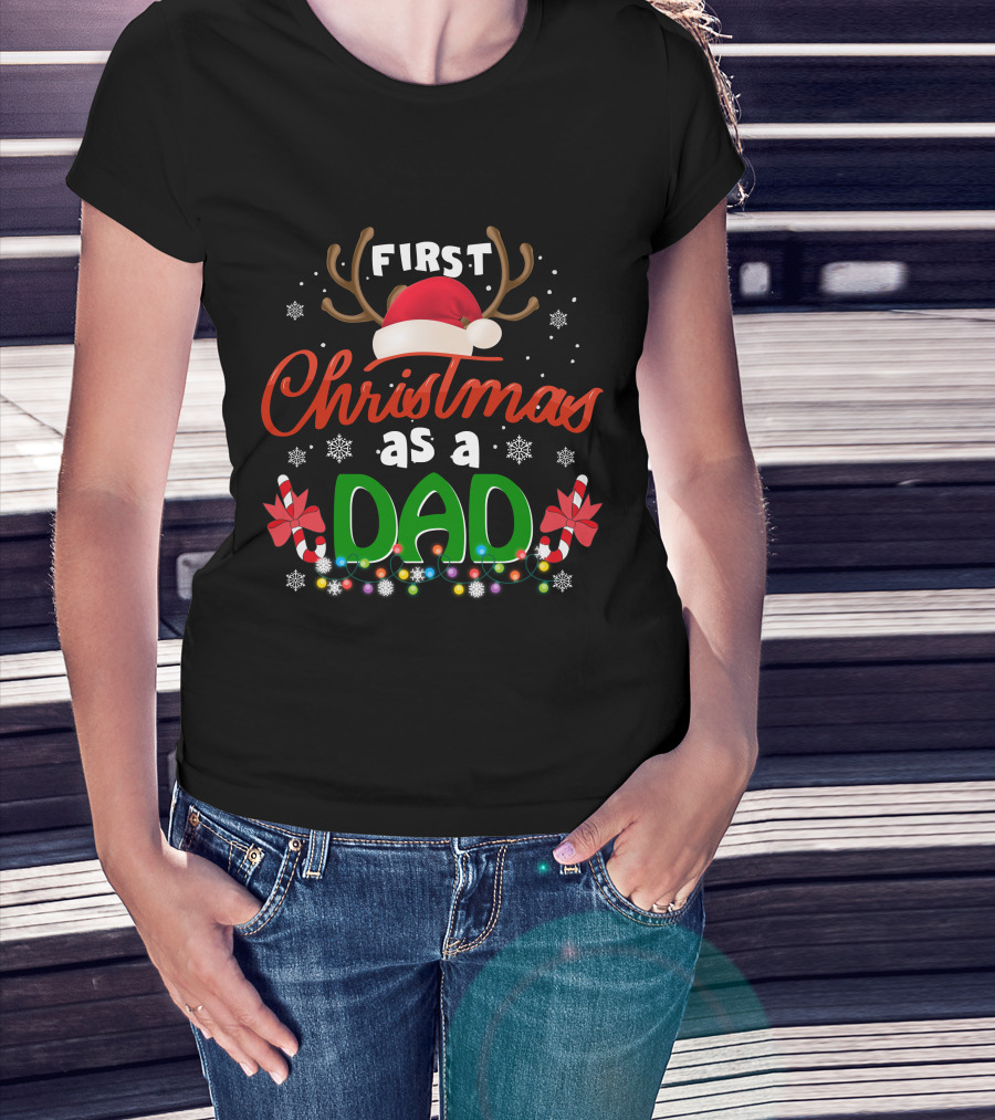 First Christmas As A Dad With Reindeer Antlers Santa Hat And Candy Canes T-Shirt