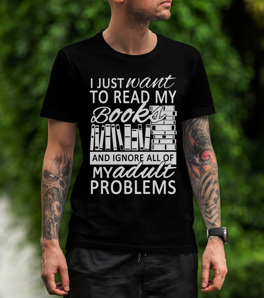 The I Just Want To Read My Books With Stacked Book Pattern And Ignore All Of My Adult Problems T-shirt is designed for everyday wear and a consistent fit. Fabric is pre-shrunk ring-spun cotton with durable stitching. See the size chart below for exact measurements.