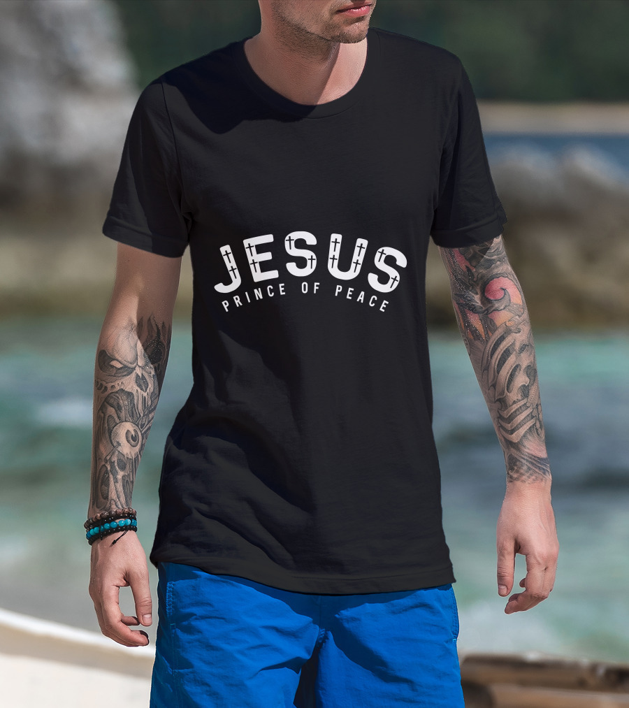 The Jesus Prince Of Peace Cross T-shirt is designed for everyday wear and a consistent fit. Fabric is pre-shrunk ring-spun cotton with durable stitching. See the size chart below for exact measurements.