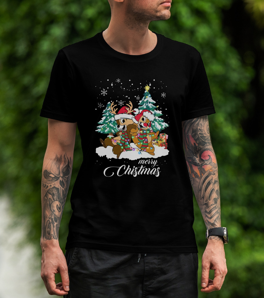 The Merry Christmas Chip And Dale Holiday Cheer Reindeer Antlers Santa Hats Winter Wonderland T-shirt is designed for everyday wear and a consistent fit. Fabric is pre-shrunk ring-spun cotton with durable stitching. See the size chart below for exact measurements.