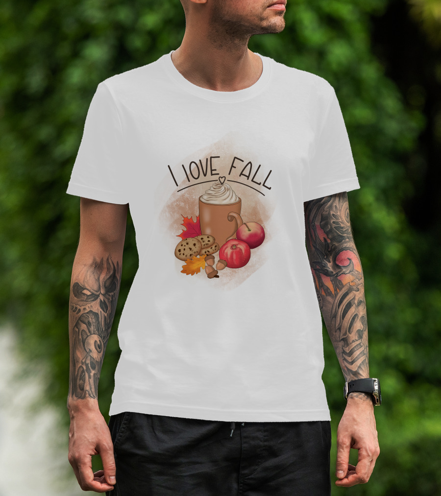 The I Love Fall Coffee Apples Cookies Leaves Acorns T-shirt is designed for everyday wear and a consistent fit. Fabric is pre-shrunk ring-spun cotton with durable stitching. See the size chart below for exact measurements.