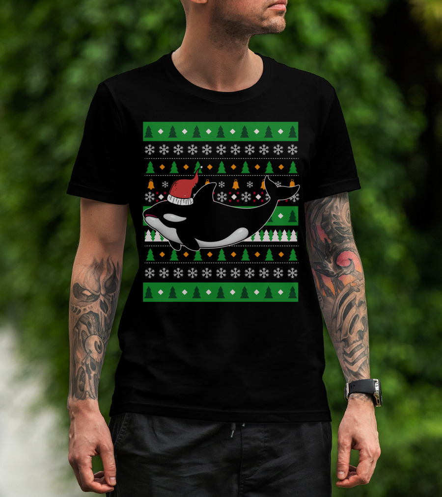 Orca Zookeeper Ugly Christmas Killer Whale Santa Hat Snowflakes Trees T-Shirt