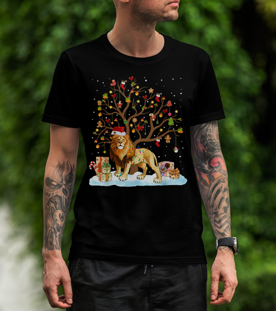 Lion With Christmas Tree Ornaments And Gifts T-Shirt