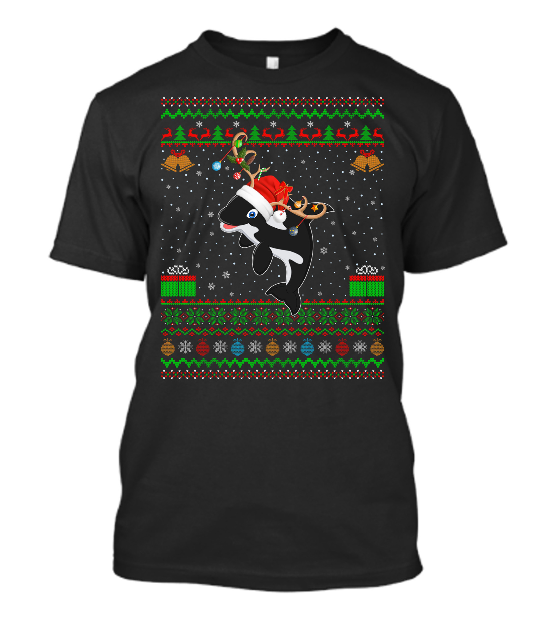 The Ugly Christmas Orca Whale in Santa Hat with Xmas Lighting and Reindeer Antlers T-shirt is designed for everyday wear and a consistent fit. Fabric is pre-shrunk ring-spun cotton with durable stitching. See the size chart below for exact measurements.