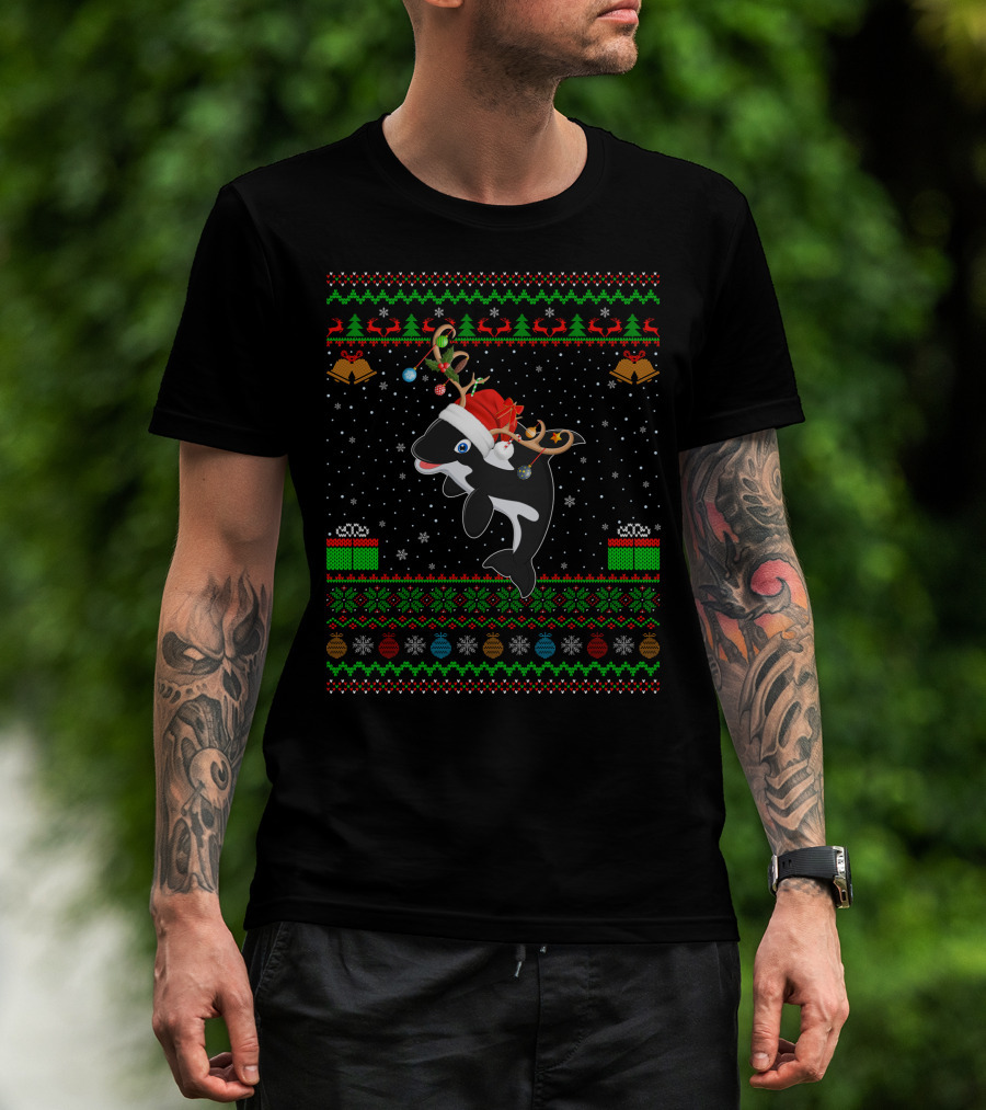 Ugly Christmas Orca Whale In Santa Hat With Xmas Lighting And Reindeer Antlers T-Shirt