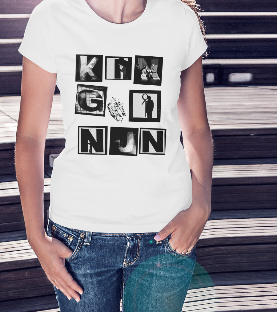 The KING NUN SQUARES MERCH BLACK WHITE BLOCKS T-shirt is designed for everyday wear and a consistent fit. Fabric is pre-shrunk ring-spun cotton with durable stitching. See the size chart below for exact measurements.