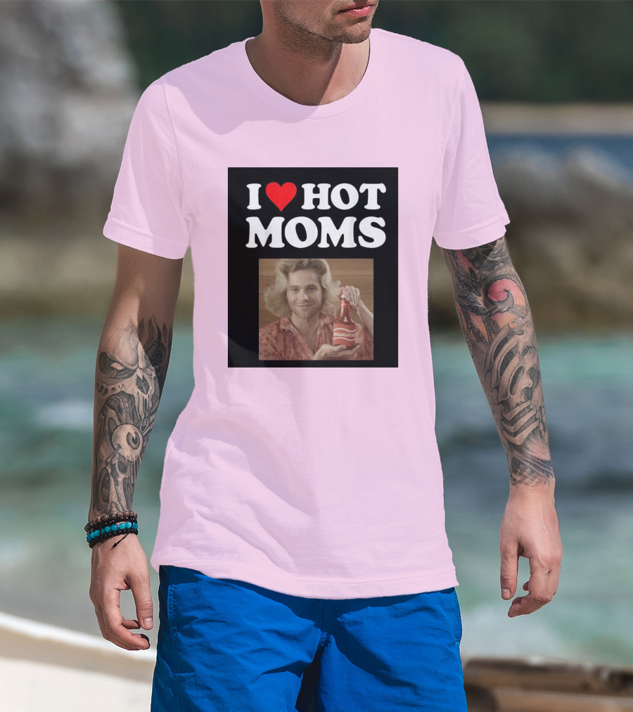 I Love Hot Moms Sauce Bottle Person Image Pink Background T-Shirt