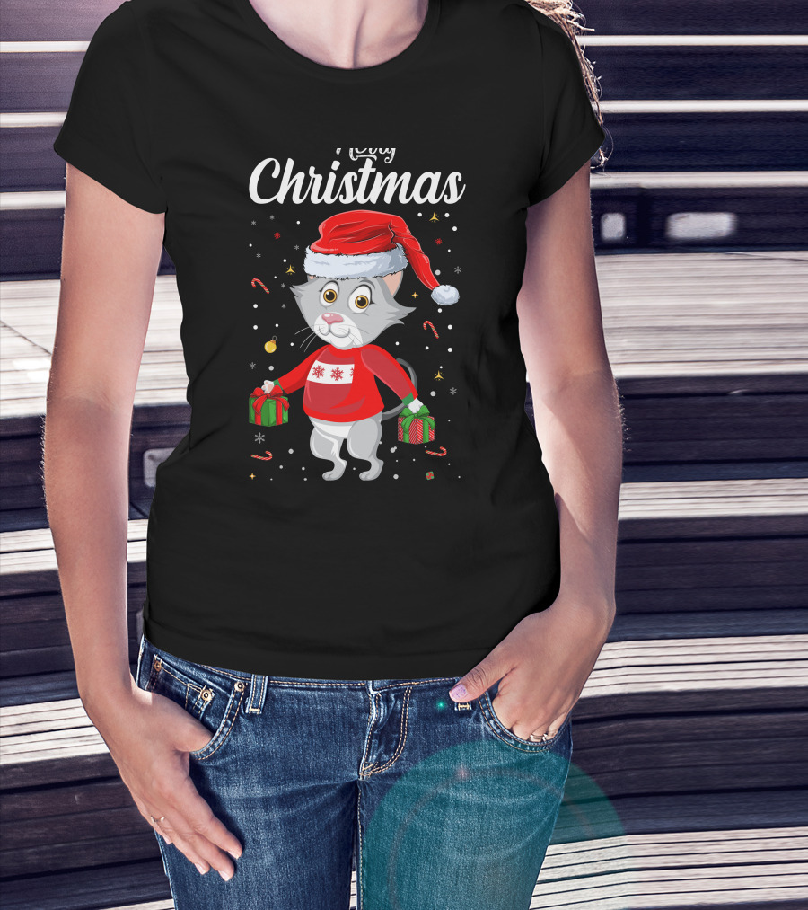 Merry Christmas Catboy With Santa Hat And Gifts T-Shirt