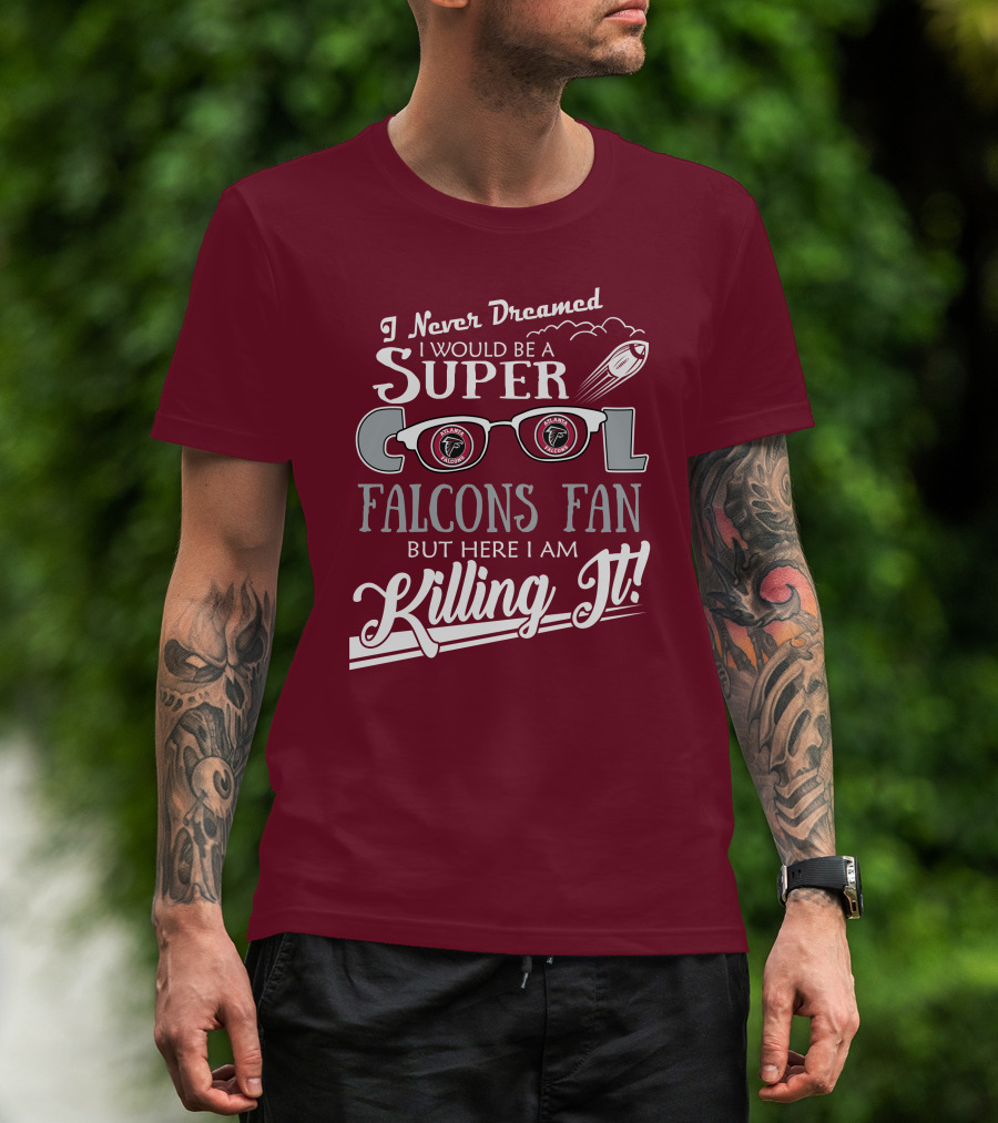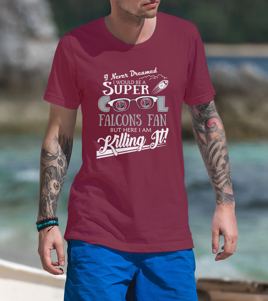 The I Never Dreamed I Would Be a Super Cool Atlanta Falcons Fan But Here I Am Killing It T-shirt is designed for everyday wear and a consistent fit. Fabric is pre-shrunk ring-spun cotton with durable stitching. See the size chart below for exact measurements.