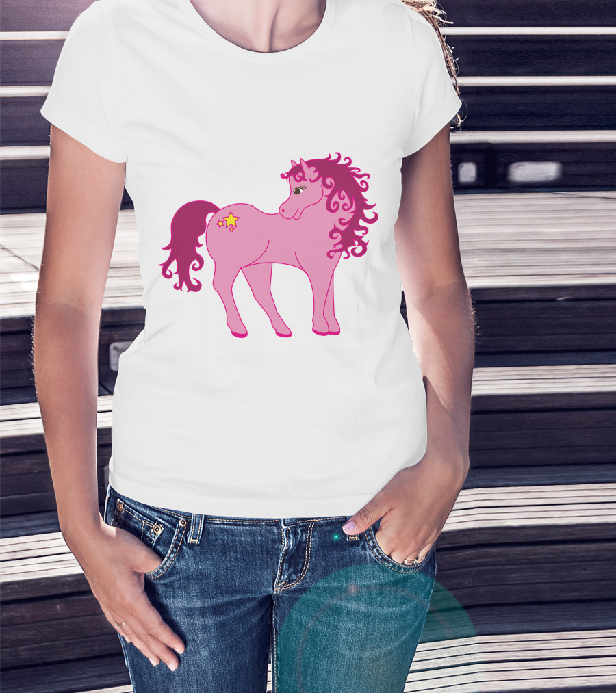 The Cute Pink Pony with Curly Mane and Star Markings T-shirt is designed for everyday wear and a consistent fit. Fabric is pre-shrunk ring-spun cotton with durable stitching. See the size chart below for exact measurements.