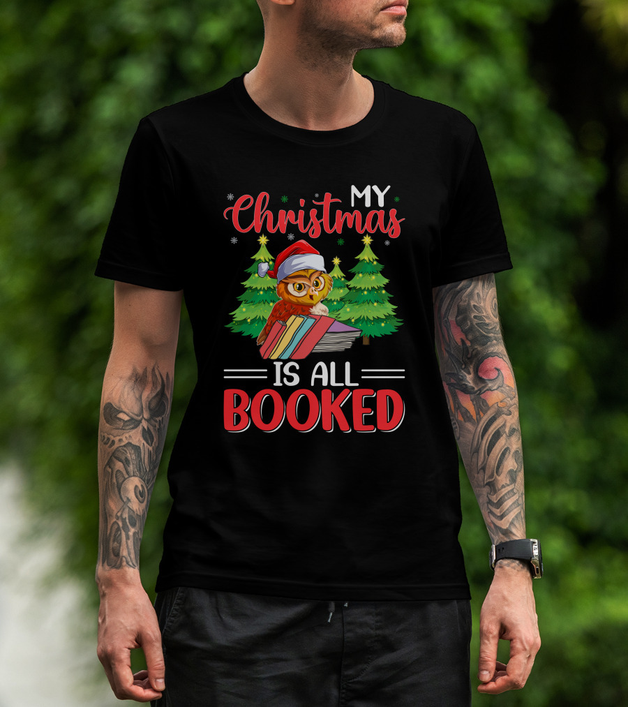 My Christmas Is All Booked Owl With Santa Hat And Holiday Trees T-Shirt