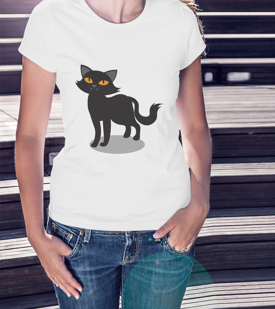 Cartoon Black Cat Illustration With Orange Eyes And Shadow T-Shirt