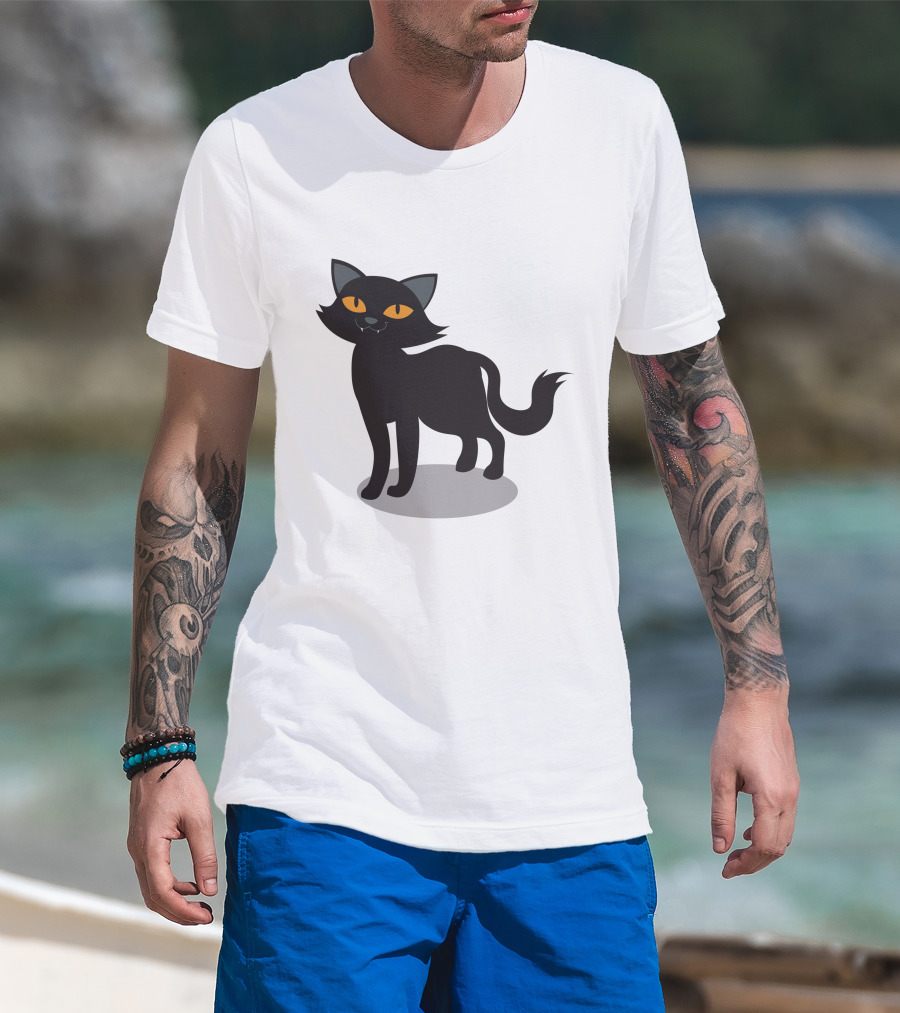 The Cartoon Black Cat Illustration with Orange Eyes and Shadow T-shirt is designed for everyday wear and a consistent fit. Fabric is pre-shrunk ring-spun cotton with durable stitching. See the size chart below for exact measurements.