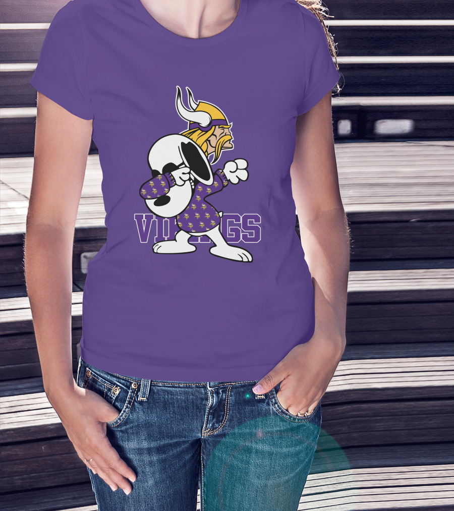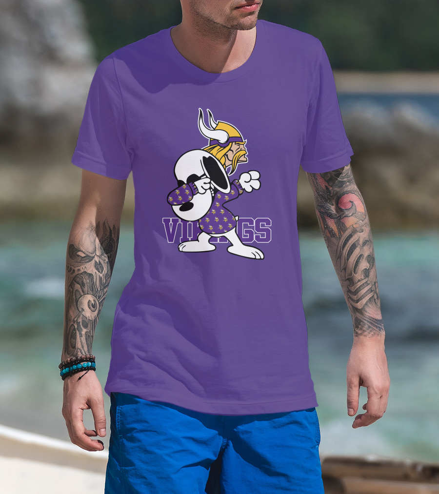 The Minnesota Vikings Snoopy Dabbing Peanuts Football Fandom T-shirt is designed for everyday wear and a consistent fit. Fabric is pre-shrunk ring-spun cotton with durable stitching. See the size chart below for exact measurements.