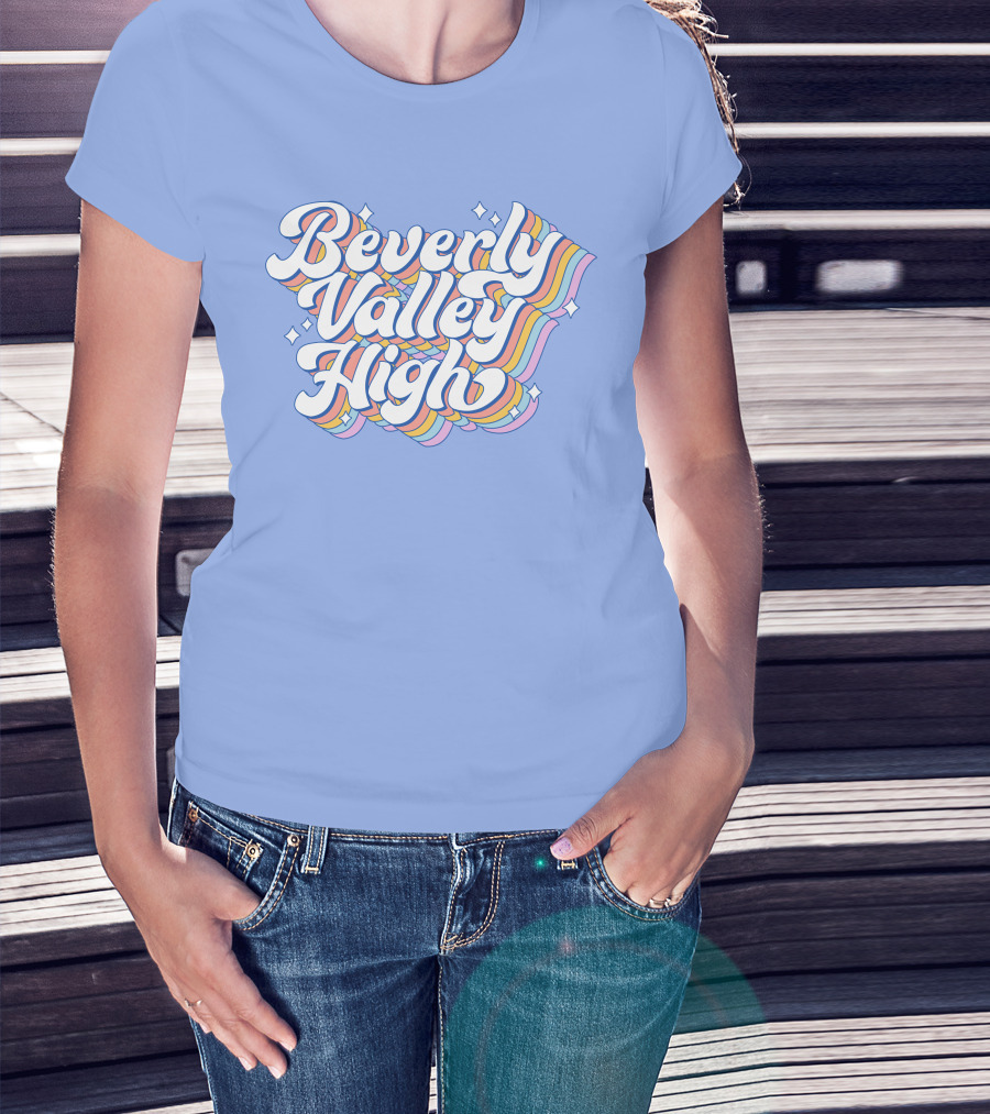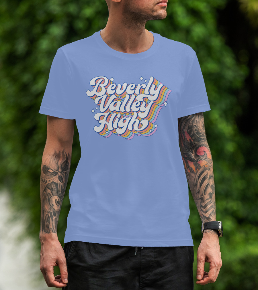 The Bvh Merch Beverly Valley High Rainbow Text with Colorful Swirls T-shirt is designed for everyday wear and a consistent fit. Fabric is pre-shrunk ring-spun cotton with durable stitching. See the size chart below for exact measurements.