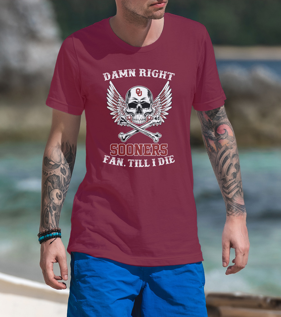 Damn Right OU Sooners Fan Till I Die Skull And Wings T-Shirt