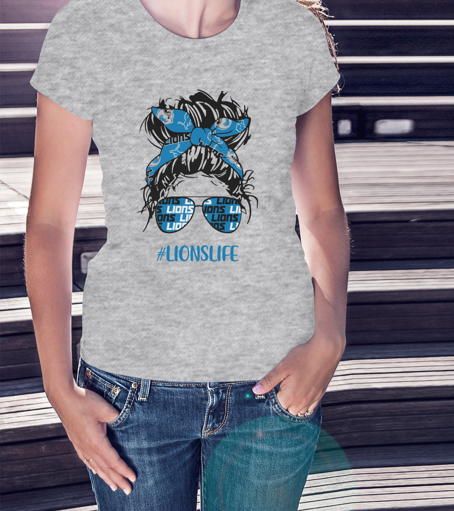 Detroit Lions Life Messy Bun Girl With Lions Headband And #LIONSLIFE Glasses T-Shirt