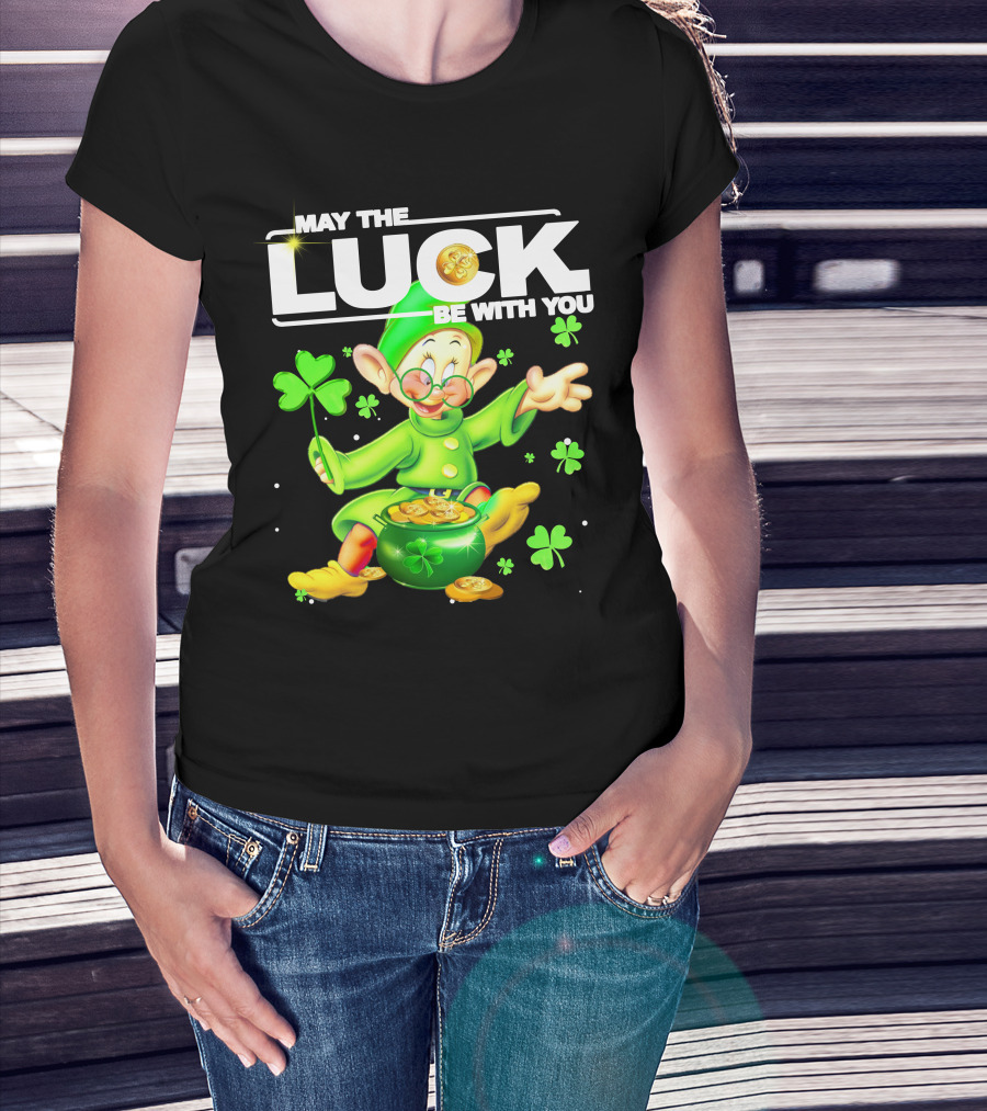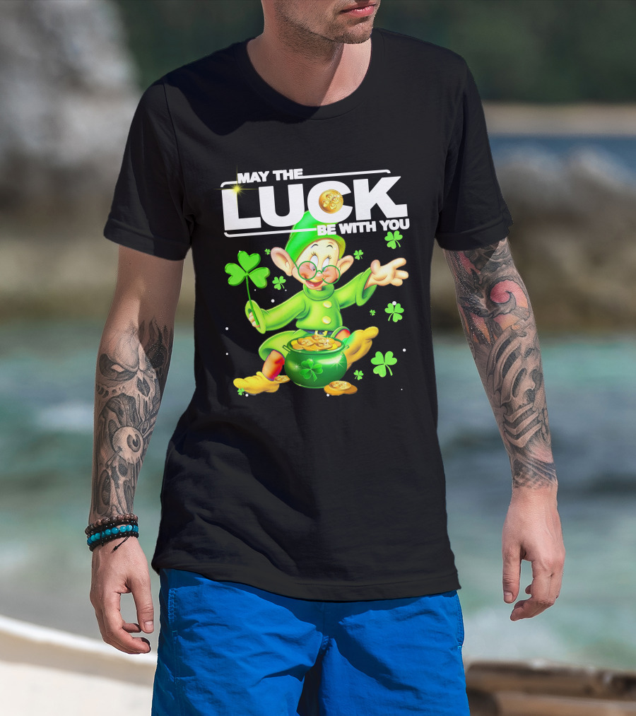 MAY THE LUCK BE WITH YOU Green Leprechaun With Gold Coins And Shamrocks T-Shirt