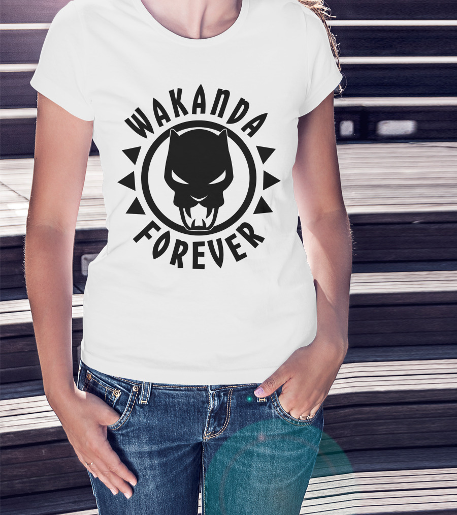 The Wakanda Forever Black Panther Circle Panther T-shirt is designed for everyday wear and a consistent fit. Fabric is pre-shrunk ring-spun cotton with durable stitching. See the size chart below for exact measurements.