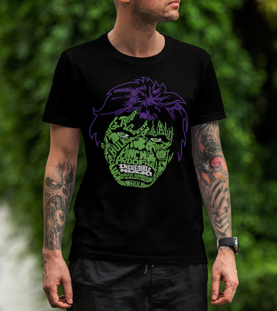 The Incredible Hulk St. Patty's Luck Smash Bruce Banner Green Proof T-shirt is designed for everyday wear and a consistent fit. Fabric is pre-shrunk ring-spun cotton with durable stitching. See the size chart below for exact measurements.