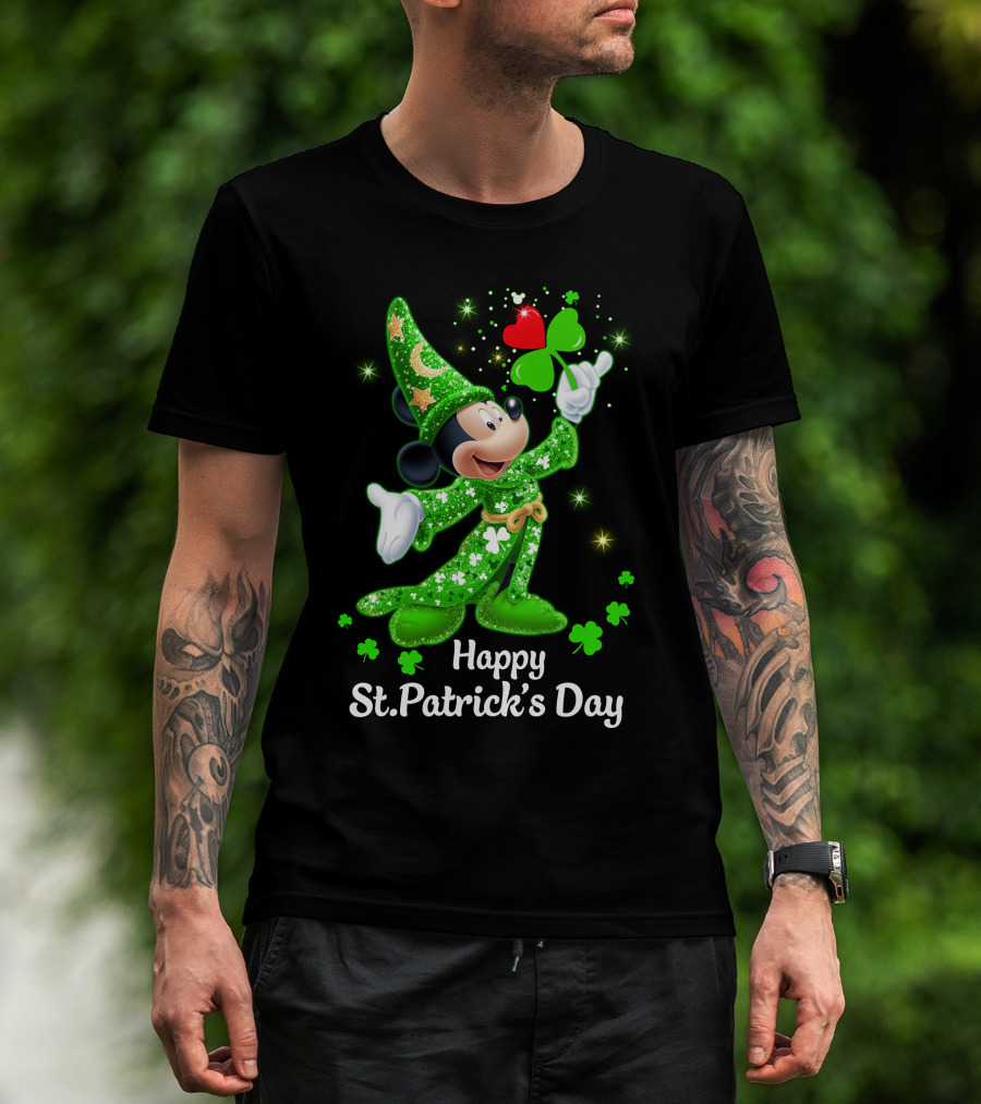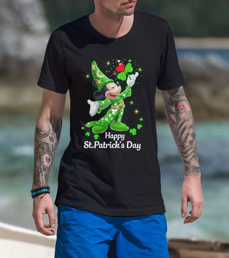 Happy St. Patrick's Day Mickey In Green Wizard Cloak With Clover Magic T-Shirt