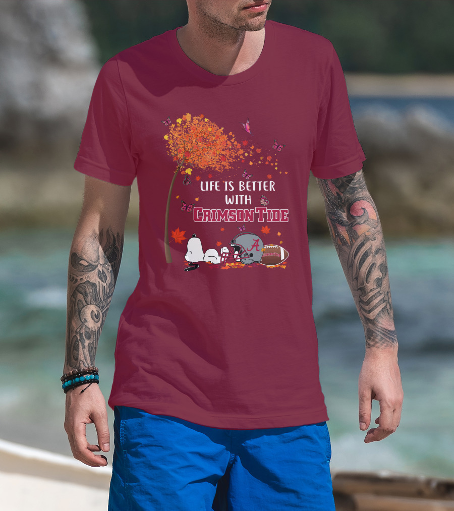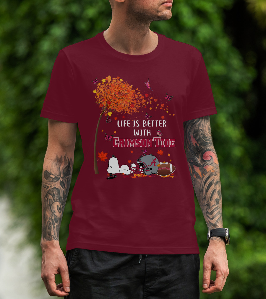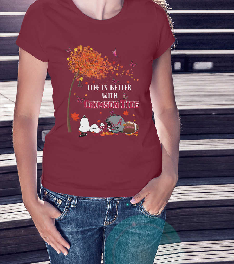 Life Is Better With Crimson Tide Alabama Football Autumn Leaves Butterflies Snoopy Woodstock T-Shirt