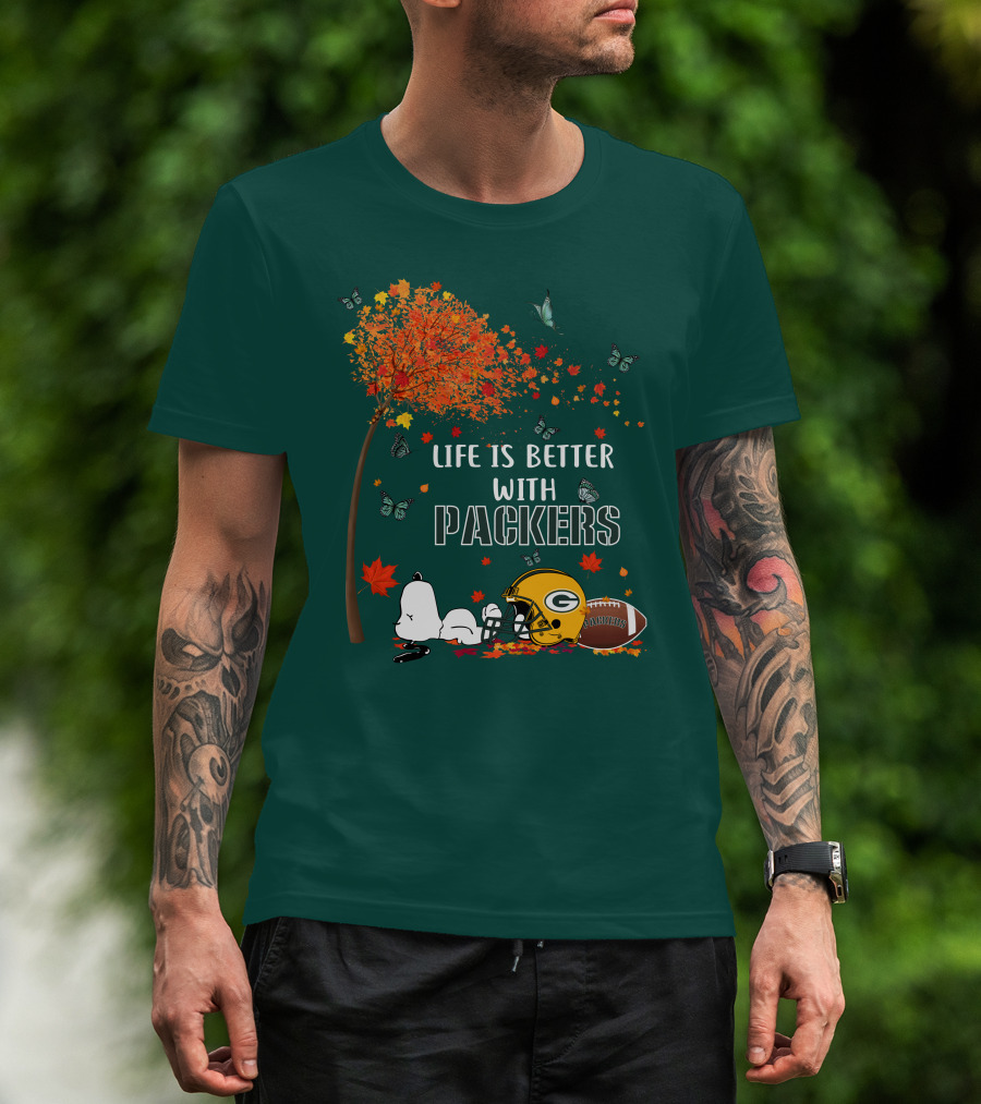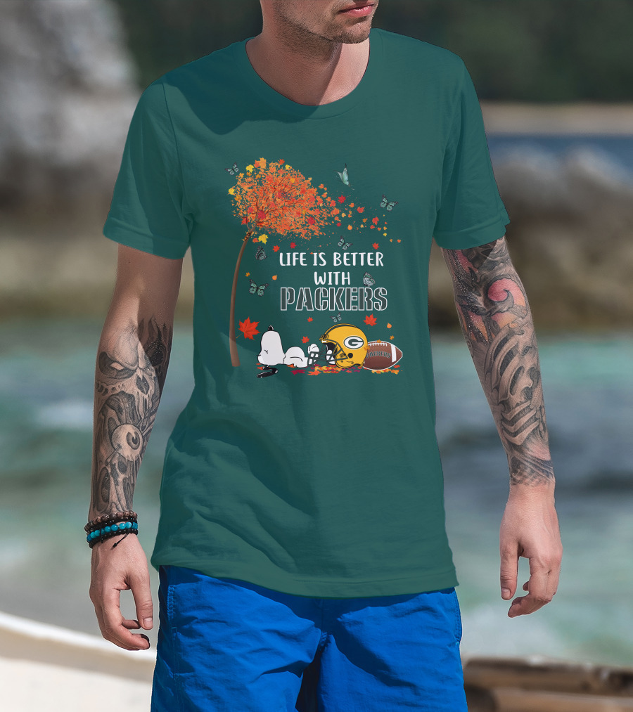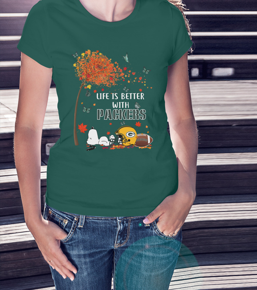 Life Is Better With Packers Green Bay Football Autumn Snoopy Leaves T-Shirt
