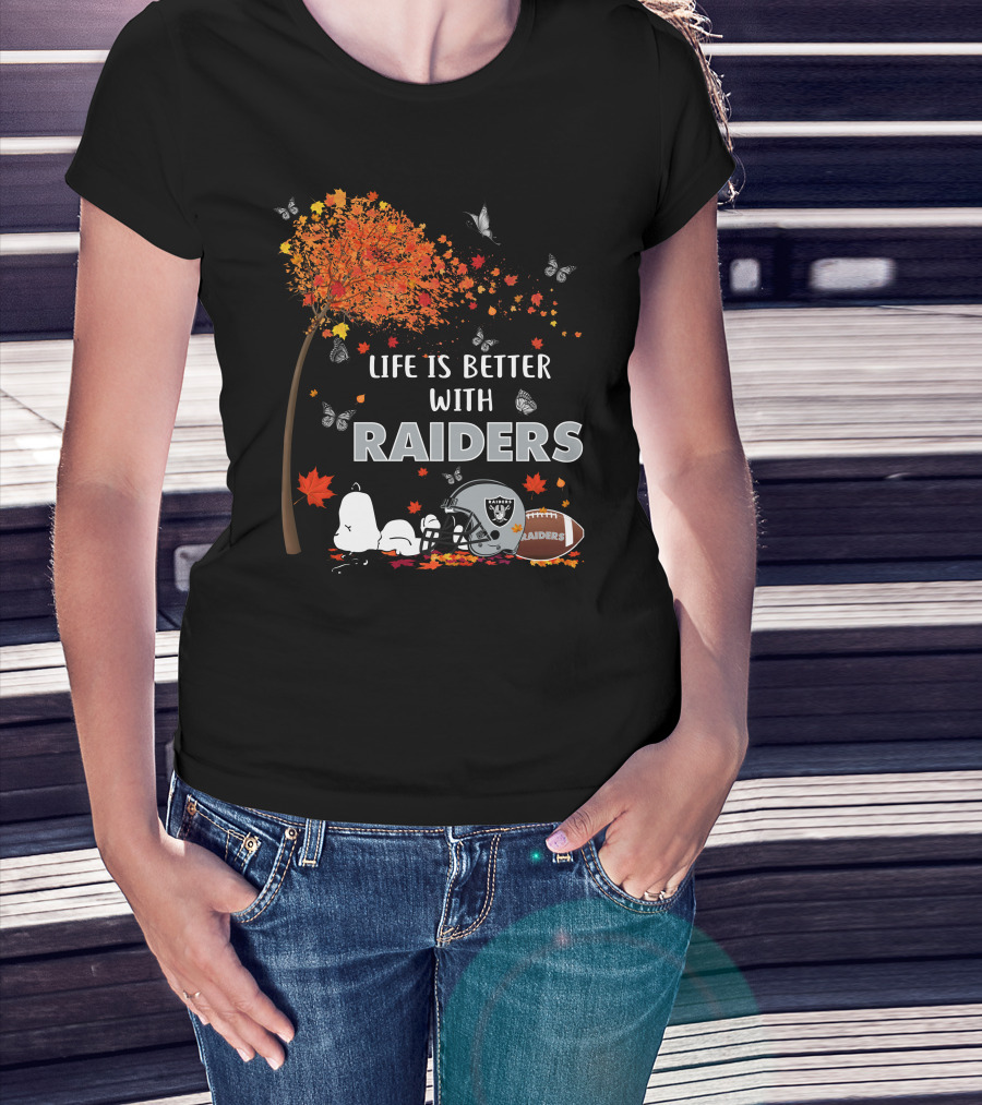 Life Is Better With Raiders Autumn Leaves And Snoopy Under Tree With Butterfly And Football Helmet T-Shirt