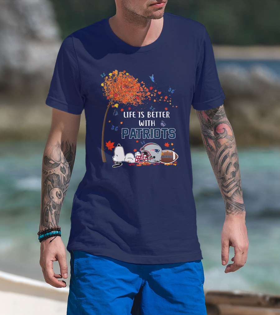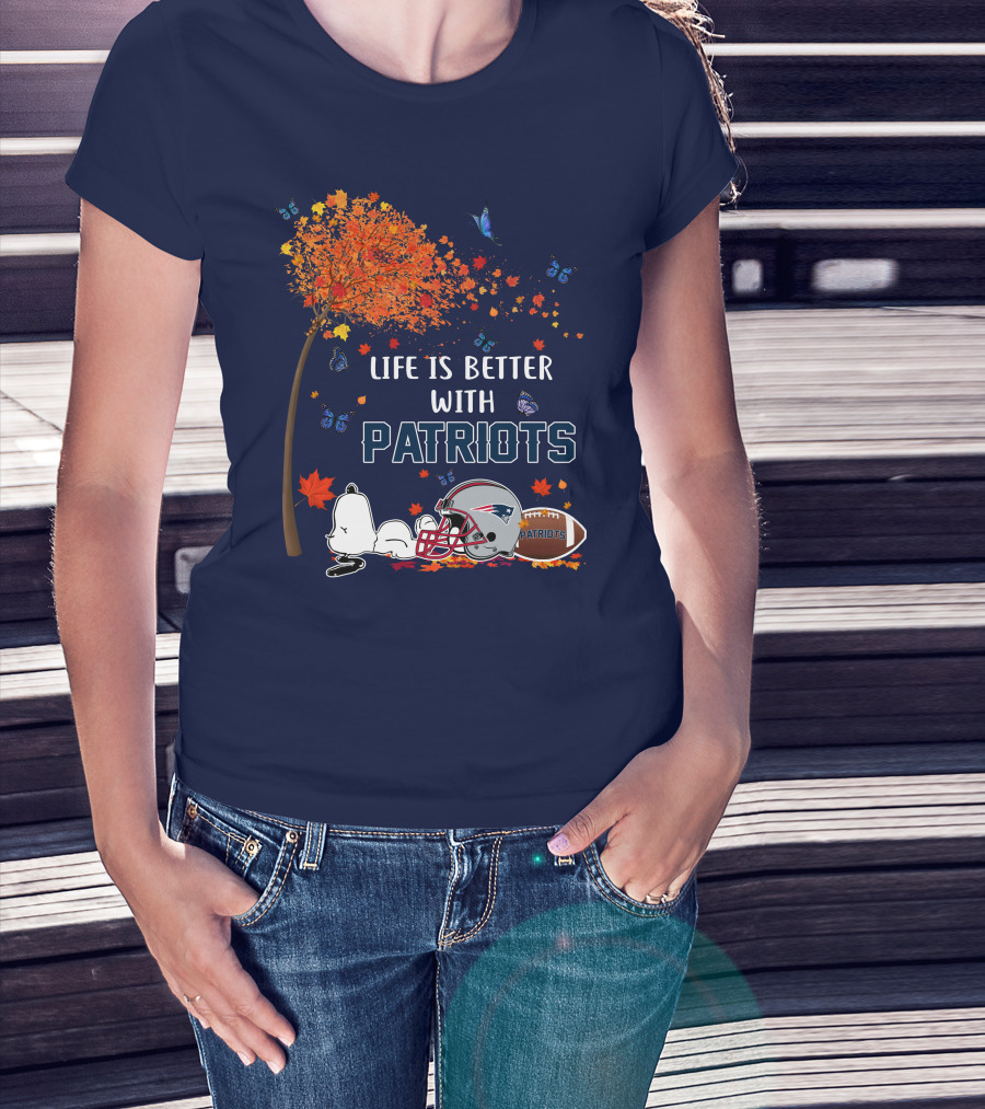 Life Is Better With Patriots New England Football Autumn Leaves And Snoopy T-Shirt