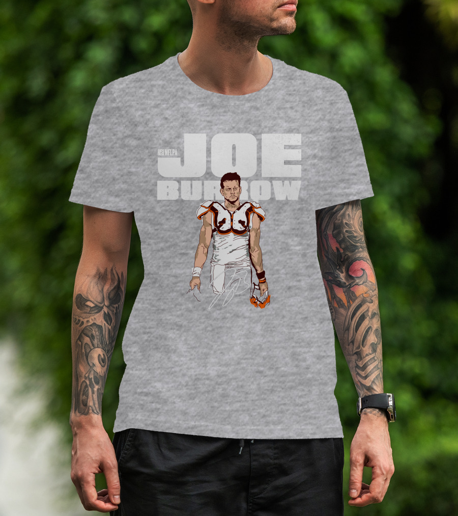 The NFLPA Joe Burrow Football Pads T-shirt is designed for everyday wear and a consistent fit. Fabric is pre-shrunk ring-spun cotton with durable stitching. See the size chart below for exact measurements.
