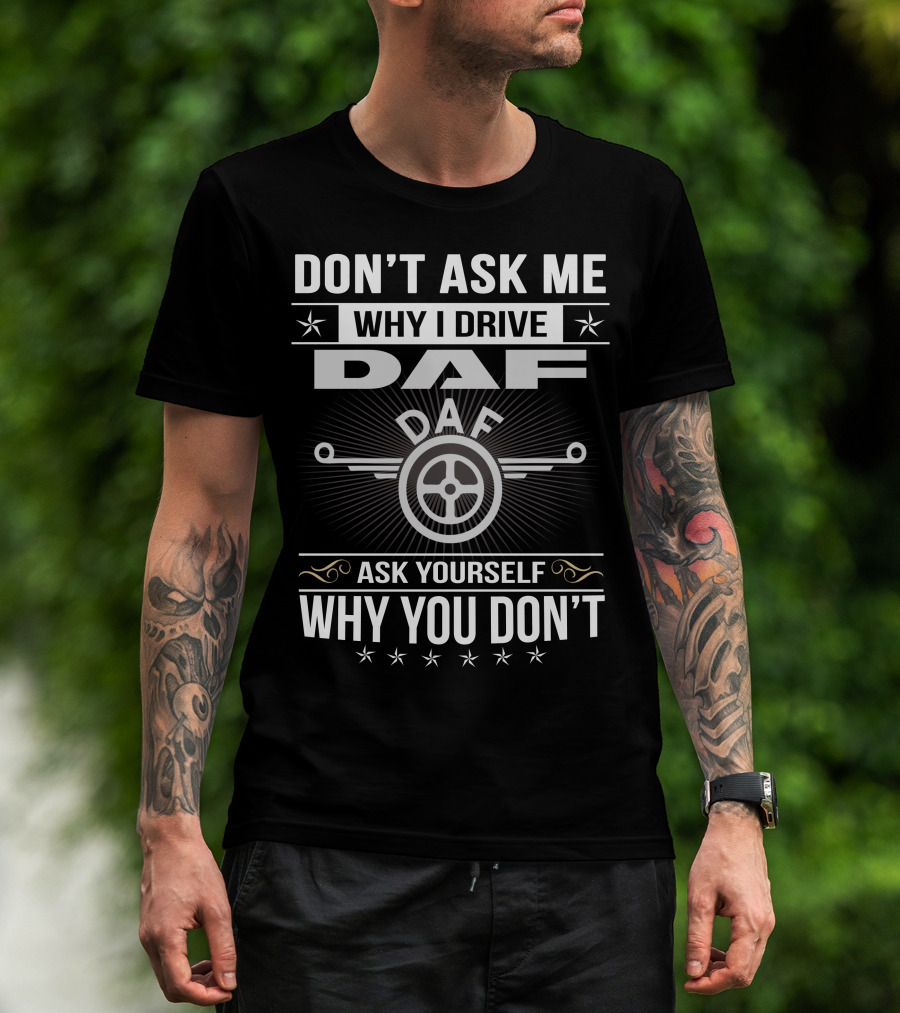 The DON'T ASK ME WHY I DRIVE DAF ASK YOURSELF WHY YOU DON'T T-shirt is designed for everyday wear and a consistent fit. Fabric is pre-shrunk ring-spun cotton with durable stitching. See the size chart below for exact measurements.