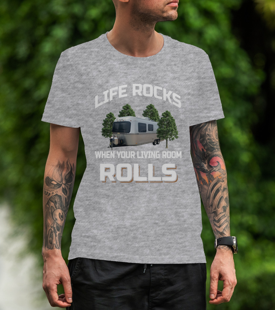 LIFE ROCKS WHEN YOUR LIVING ROOM ROLLS Avion Camper Trailer T-Shirt