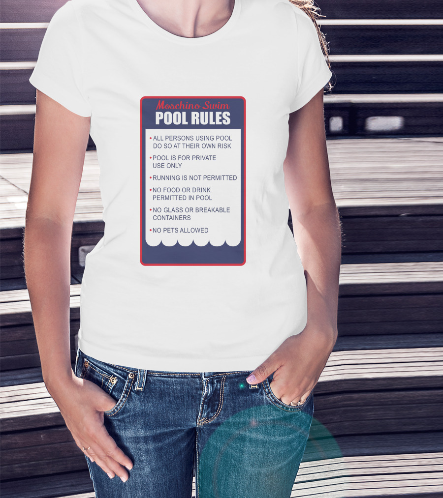 Moschino Swim Pool Rules All Persons Using Pool Do So At Their Own Risk Private Use Only No Running Food Or Drink Glass Or Breakable Containers Pets Allowed T-Shirt