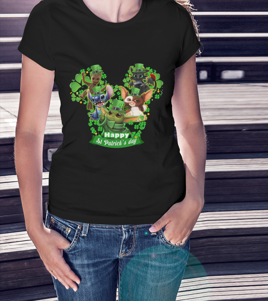 BBYD And Friends Happy St Patrick's Day Groot Gizmo Stitch Mandalorian Baby Yoda Toothless T-Shirt