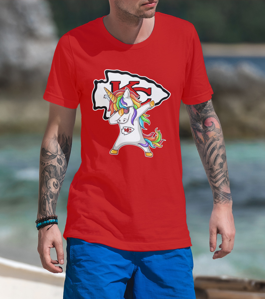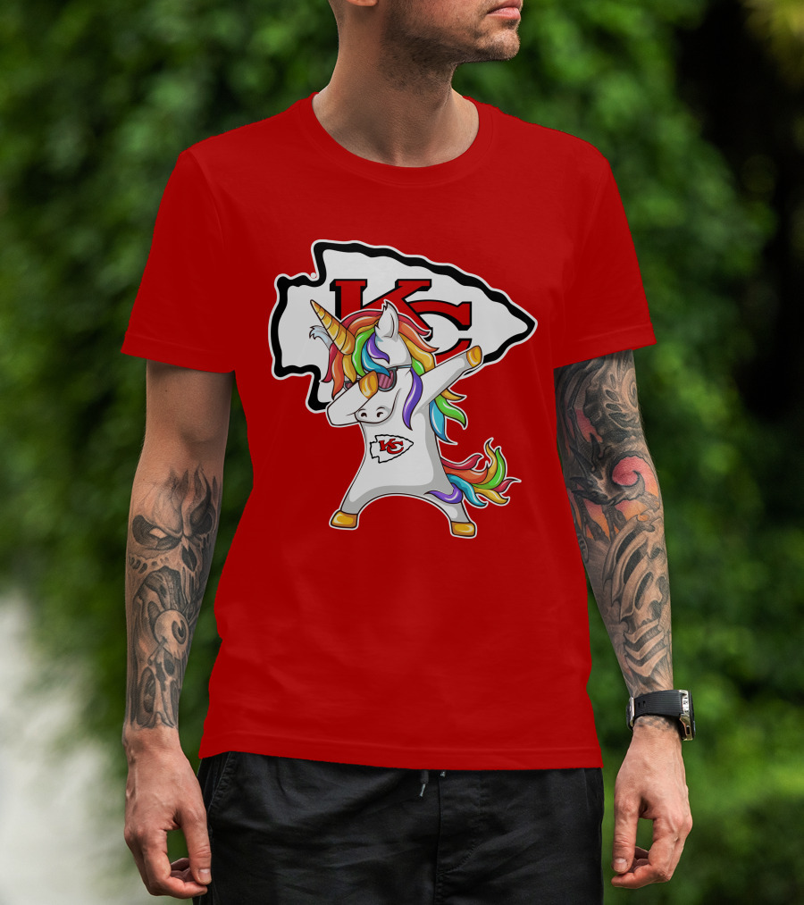The Kansas City Chiefs Unicorn Dabbing KC Logo Rainbow Mane T-shirt is designed for everyday wear and a consistent fit. Fabric is pre-shrunk ring-spun cotton with durable stitching. See the size chart below for exact measurements.