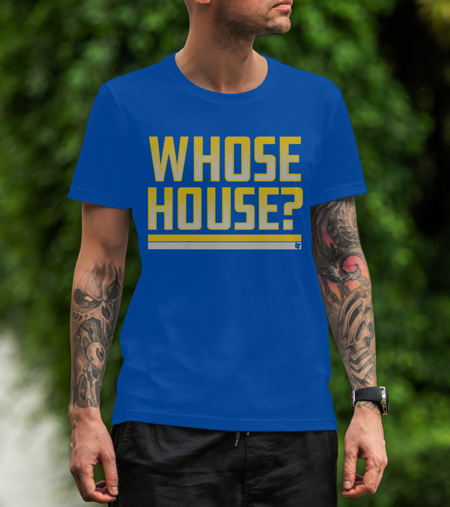 The Los Angeles Rams Whose House Blue T-shirt is designed for everyday wear and a consistent fit. Fabric is pre-shrunk ring-spun cotton with durable stitching. See the size chart below for exact measurements.