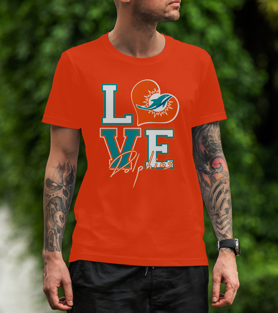 The LOVE Dolphins Miami Heart T-shirt is designed for everyday wear and a consistent fit. Fabric is pre-shrunk ring-spun cotton with durable stitching. See the size chart below for exact measurements.