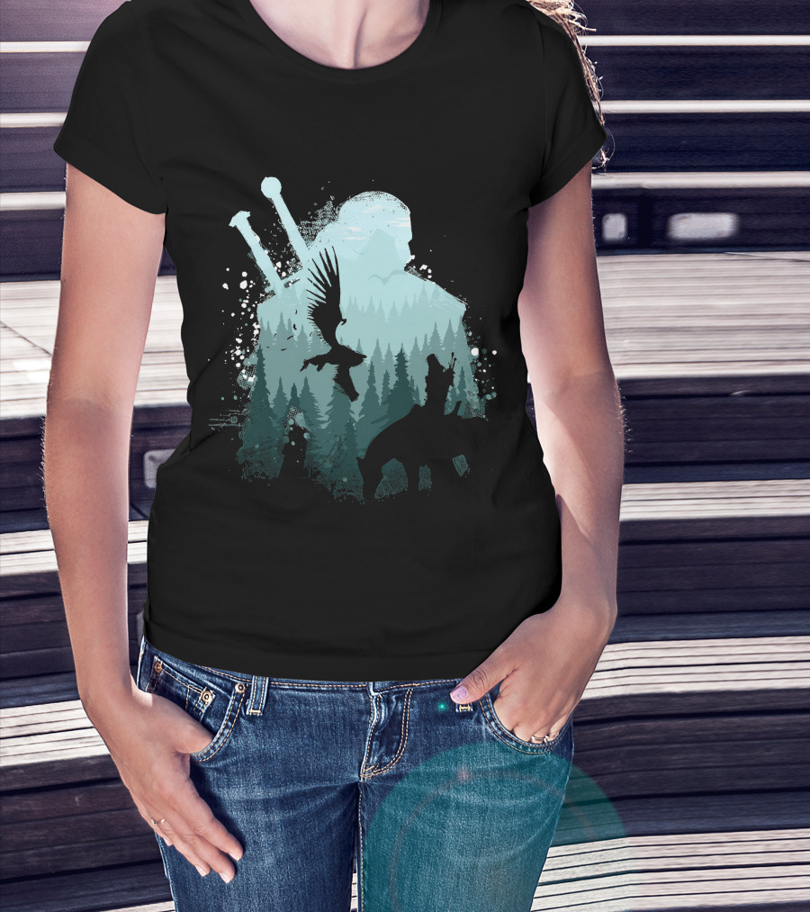 Wild Huntsman Silhouette With Swords Forest And Animals T-Shirt