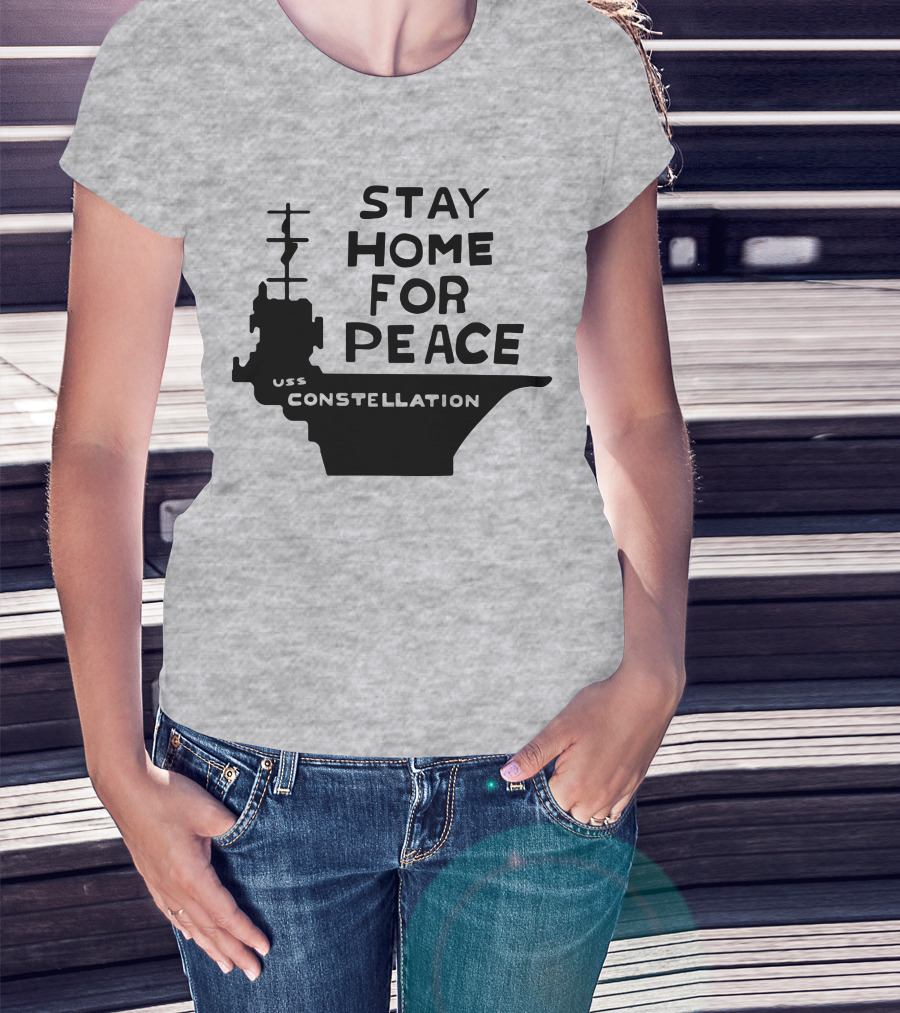 The Stay Home for Peace USS Constellation T-shirt is designed for everyday wear and a consistent fit. Fabric is pre-shrunk ring-spun cotton with durable stitching. See the size chart below for exact measurements.