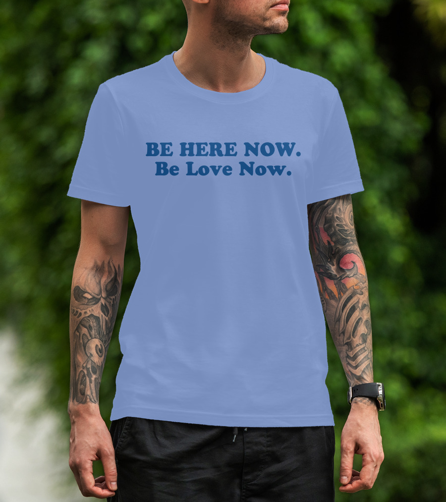 The Ram Dass Be Here Now Be Love Now Blue Text T-shirt is designed for everyday wear and a consistent fit. Fabric is pre-shrunk ring-spun cotton with durable stitching. See the size chart below for exact measurements.
