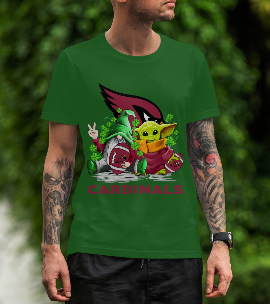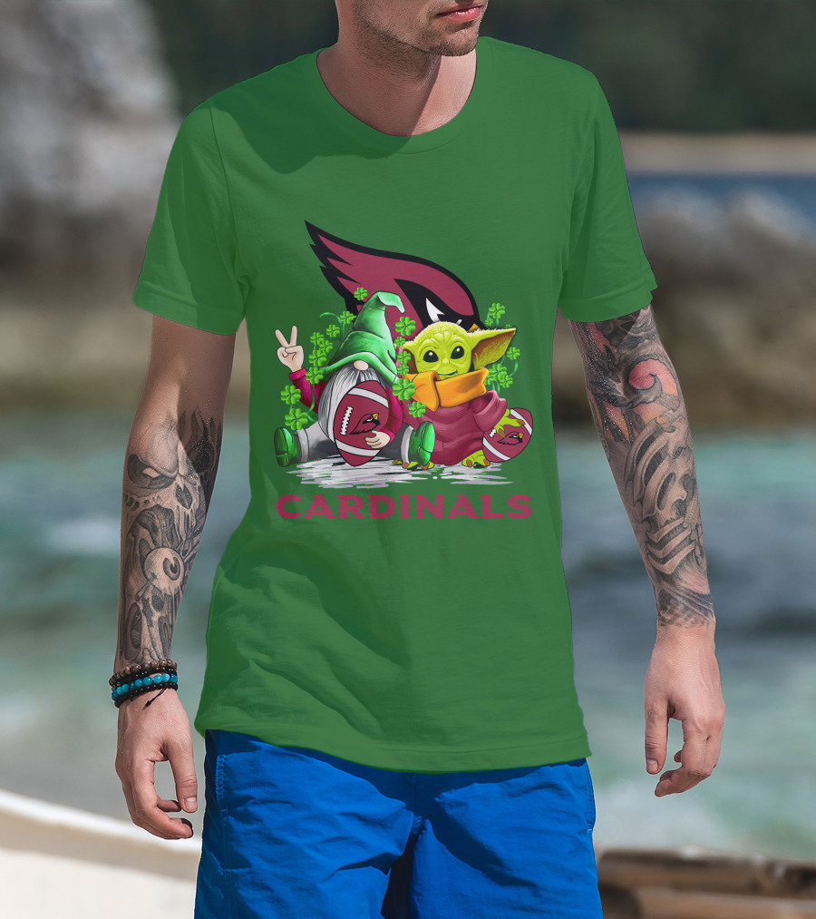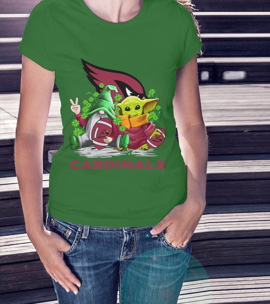 The Arizona Cardinals Football Patrick's Day Gnome and Baby Alien with Shamrocks T-shirt is designed for everyday wear and a consistent fit. Fabric is pre-shrunk ring-spun cotton with durable stitching. See the size chart below for exact measurements.